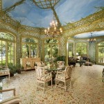 I soffitti della casa sono molto alti, i lampadari sono in cristallo, tappeti grandi e antichi, la stanza multimediale con posti a sedere e manifesti di vecchi film all’ingresso, studio e biblioteca molto grandi a due piani, mobili in legno scuro, sala da pranzo con finestre circolari, carta da parati, doppia scalinata centrale, piscina coperta con molta piantagione intorno e divani fiorati.
