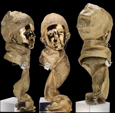 Ogni scultura è simile al soggetto che l’ha richiesta o può essere fatta su commissione con le sembianze di una persona cara, la forma è umana e ciascuna scultura commissionata è creata con un mix di metalli preziosi, bronzo, vetro, riccamente ornata come ogni opera del fantastico Gustav Klimt, splendente come la maschera d’oro di Tutankhamon e luccicante come l’uovo Fabergé.